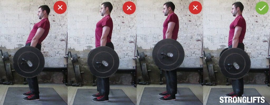 Last we see a proper lockout: upright position, no lumbar extension, no exaggerated chest puffing, and no shrugging. This is how you want to finish your deadlift.