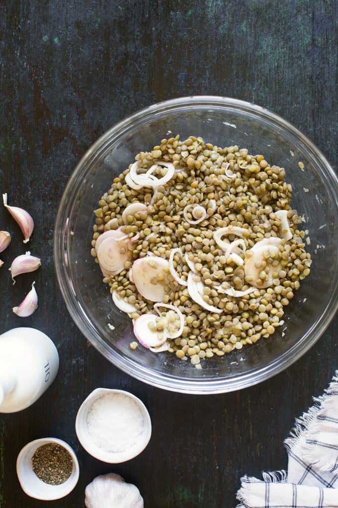 - Drain the lentils well, then toss with the marinated onion. Stir in olive oil and garlic, and season to taste with salt and pepper. Let lentils cool completely.