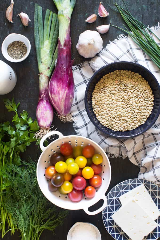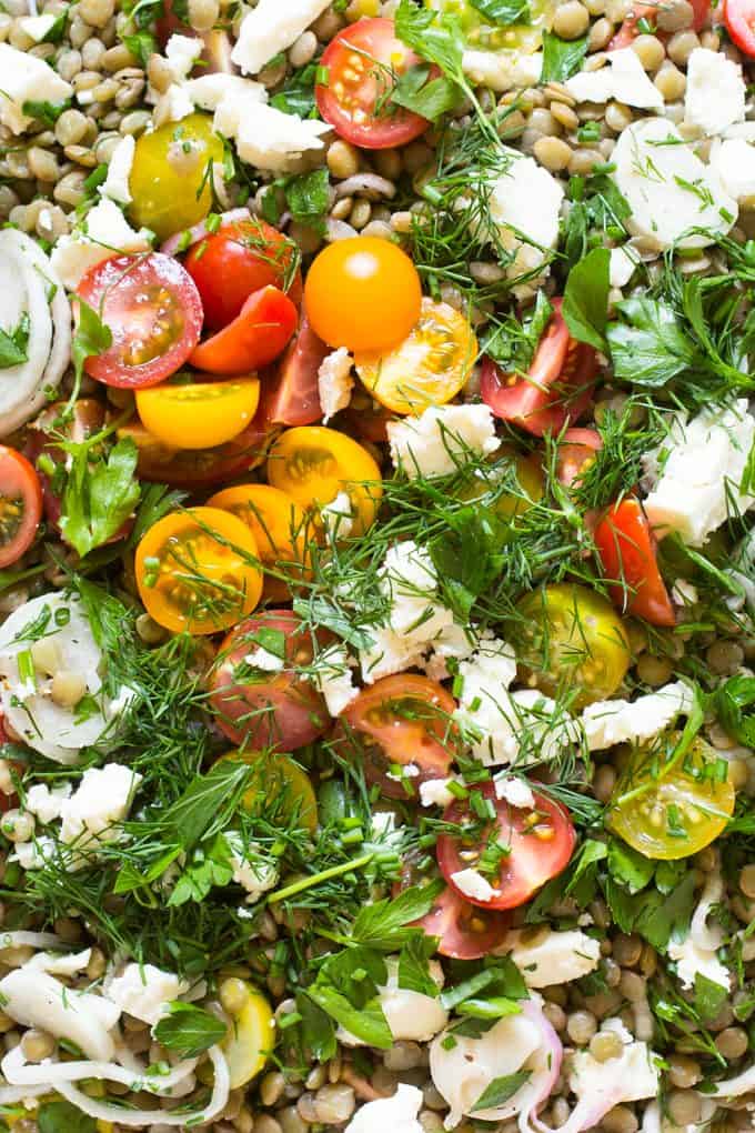 Today I’m sharing a simple and delicious lentil salad. The recipe starts with a sliced onion marinated in a red wine vinegar and salad. Whole green lentils are then cooked until al dente and tossed with the marinated onion, garlic, olive oil, salt and pepper. The salad is finished with a flurry of fresh herbs, juicy ripe tomatoes and crumbles of salty feta. With each bite, you’ll get a little earthiness from the lentils balanced with freshness of the tomatoes and herbs. The feta and marinated onions add bold pops of flavor throughout.